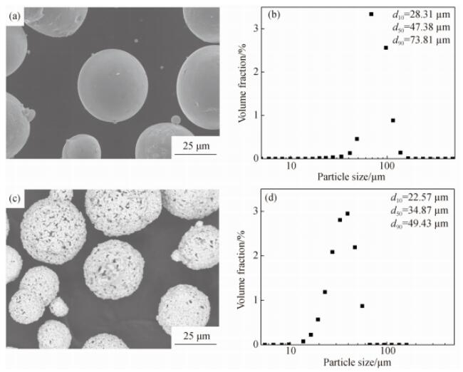 Fig.1 SEM images of surface morphology (a,c) and particle size distribution(b,d)of 9Cr18Ni12 powder(a,b)and WC10Co4Crpowder(c,d)