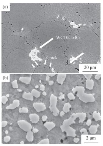 Fig.4 SEM images of cross-sectional microstructure(a)and grain structure(b)of 9Cr18Ni12/WC10Co4Cr composite with heat treatment