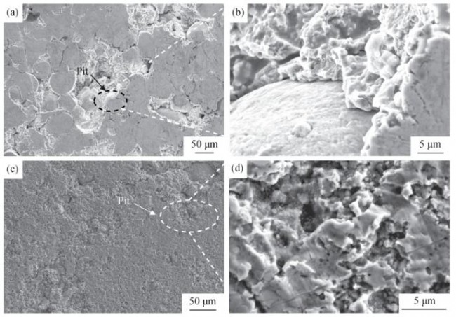 Fig.7 SEM images of surface morphology of as-printed(a,b)and heat-treated(c,d)9Cr18Ni12/WC10Co4Cr composite for 8 h of cavitation testing