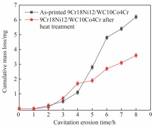 Fig.8 Cavitation mass loss of 9Cr18Ni12/WC10Co4Cr composites as function of erosion time