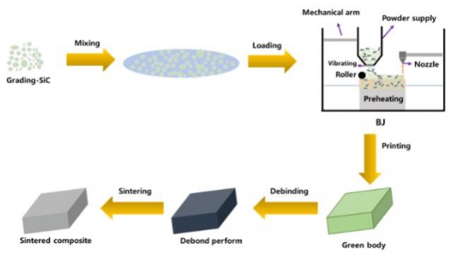 先进碳化硅陶瓷以其高强度、高硬度、热学和化学稳定性优异等优点,是耐受极端服役环境的关键候选材料。然而,碳化硅陶瓷的传统制备工艺存在周期长、成本高和后加工难等瓶颈问题。为满足大尺寸复杂形状构件的需求,研究人员采用3D打印技术制备碳化硅陶瓷,而黏结剂喷射(或粘结剂喷射,英文:Binder Jetting, 简称BJ)3D打印就是一种能够突破传统成型方法约束的重要3D打印技术。值得注意的是,颗粒级配是可以有效改善陶瓷素坯成型性能,通过优化颗粒级配参数,从而提高粉末原料的流动性和堆积性,最终优化碳化硅陶瓷的力学性能。结合这两种技术,能够优化提升复杂形状碳化硅陶瓷的综合性能。