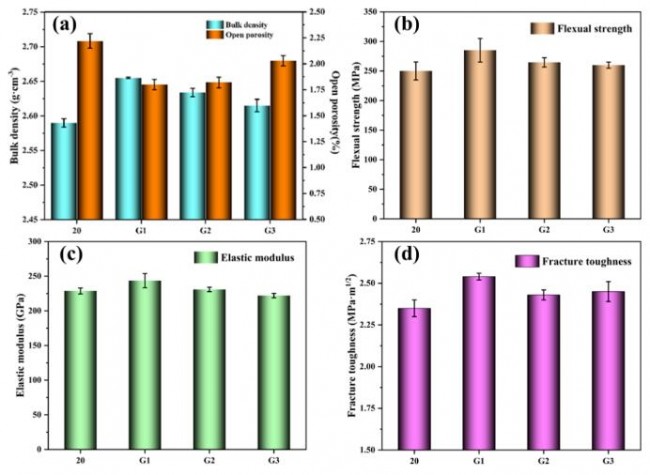 对比级配前后的粉体发现,流动性越好的粉体,其制备的陶瓷致密度越好,这与粉体堆积有很大的关联,颗粒级配堆积的效果越好,致密度越佳。此外,随着级配后SiC颗粒流动性提升,抗弯强度和弹性模量均获得了优化提升。由此可见,原料级配有利于提高陶瓷抗弯性能、弹性模量和断裂韧性等综合力学性能。