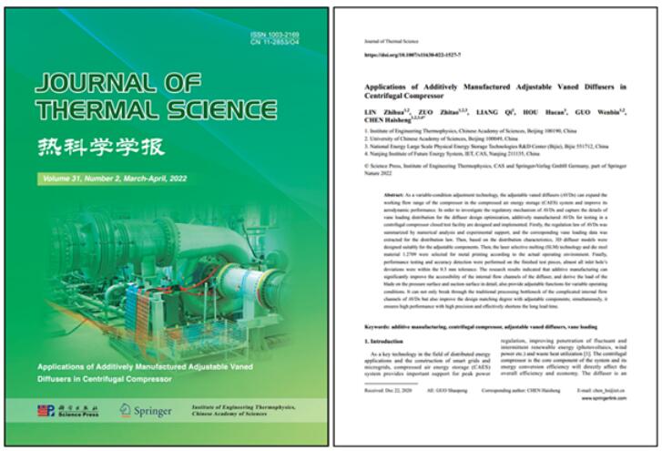 该扩压器设计与制造相关研究成果已作为封面文章,发表在Journal of Thermal Science上。该新方法已授权发明专利1项,授权实用新型专利2项。