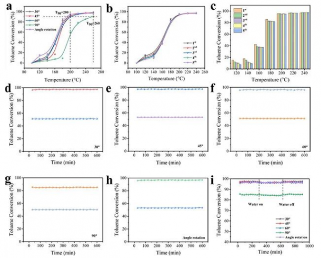 研究人员测试了甲苯蒸汽在不同旋转角度的仿生布利冈结构陶瓷催化反应器中的氧化情况和陶瓷催化反应器循环使用5次后的催化活性。相比粉末催化剂,整体式的陶瓷催化反应器不仅具有优良的催化活性,而且具有优良的重复使用性和更好的水稳定性。此外,研究人员通过流体力学分析验证了不同的结构中流体通过的静态压和湍流动能分布,辅助验证了结构设计对催化性能的影响。