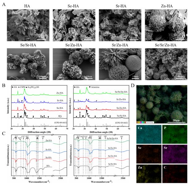 图 2. HA、Se-HA、Sr-HA、Zn-HA、Se/Sr-HA、Se/Zn-HA、Sr/Zn-HA 和 Se/Sr/Zn-HA 的表征。(A)SEM图像,(B)XRD图谱,(C)FTIR光谱和(D)Se/Sr/Zn-HA的元素分布。