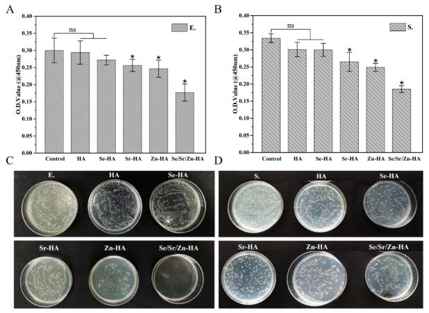 图 3. HA,Se-HA,Sr-HA,Zn-HA和Se/Sr/Zn-HA浸提液与细菌共培养24小时的抗菌性能评价。(A)浸提液与大肠杆菌共培养后的OD值;(B)浸提液与金黄色葡萄球菌共培养后的OD值;(C)大肠杆菌和浸提液共涂板;(D)金黄色葡萄球菌和浸提液共涂板。
