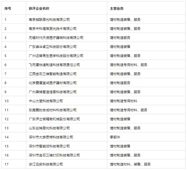 其中,南京铖联激光科技有限公司、南京中科煜宸激光技术有限公司、无锡时代天使医疗器械科技有限公司、广东峰华卓立科技股份有限公司、广州迈普再生医学科技股份有限公司等17家以增材制造为主营业务的企业成功入选名单(见下方表格),截至目前共有36家增材制造企业获评国家专精特新“小巨人”企业。