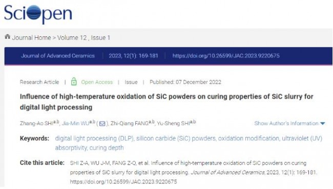 近些年,增材制造技术的发展为复杂结构SiC陶瓷的制备提供了可能性。数字光处理 (DLP) 作为一种光固化增材制造工艺,具有很高的成形精度和成形质量,被广泛运用于生物支架、电子元器件、机械耐热结构件等精密陶瓷件的加工领域。虽然氧化物陶瓷的DLP制备比较成熟,但是SiC等非氧化陶瓷的DLP制造依然存在困难,主要难点在于:相比于各类氧化物陶瓷,非氧化物SiC陶瓷对紫外光具有更高的折射率和吸光度。因此,在DLP成形过程中紫外光被大量反射、散射和吸收,导致浆料固化深度低难以固化成形。