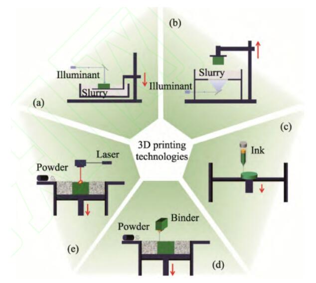 陶瓷型芯3D打印技术分类:(a)立体光刻成型SLA;(b)数字光处理成型DLP;(c)墨水直写成型DIW;(d)黏结剂喷射成型BJ;(e)激光选区烧结SLS