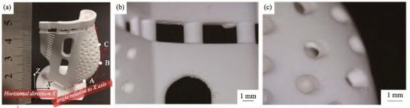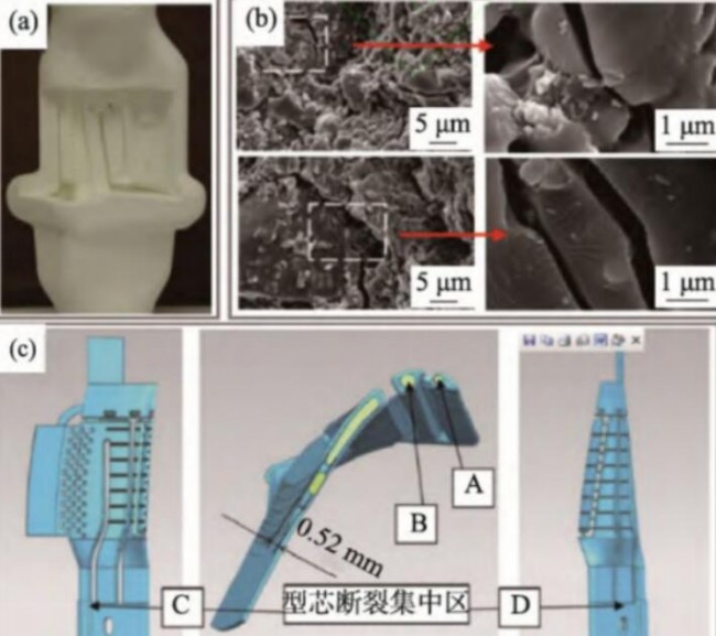 (a)立体光刻成型3D打印制备氧化铝基陶瓷型芯;(b)(c)氧化铝基陶瓷型芯光学放大照片