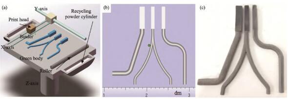 黏结剂喷射成型3D打印制备陶瓷流道芯:(a)打印过程;(b)3D模型图;(c)氧化铝陶瓷流道芯坯体