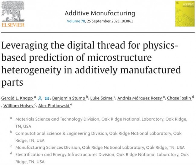 在ORNL橡树岭国家实验室最近发表在《增材制造》杂志上的论文“利用数字线程对增材制造零件中基于物理的微观结构异质性进行预测”中,展示了一种经过验证的计算方法来预测不锈钢 316-L 零件中不同区域凝固条件的影响。作为验证的一部分,ORNL橡树岭国家实验室表明相应竣工零件的不同区域的微观结构晶粒尺寸和晶体织构存在定量差异。