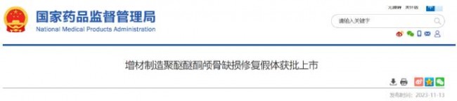 2023年11月13日,国家药监局更新了康拓医疗(688314)的增材制造聚醚醚酮颅骨缺损修复假体产品获批消息。原文如下: