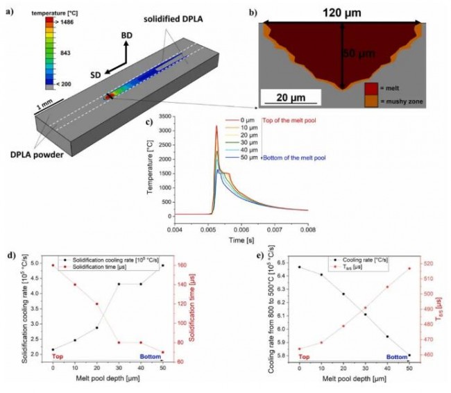 图 2. 使用 FE 模型对竣工 120 W 状态进行单轨模拟,构建和扫描方向分别被描述为BD和SD。(a) 模拟设置显示在选定的 L-PBF 条件下凝固过程中的瞬态温度分布和熔池几何形状,(b) 模拟熔池的相应横截面,(c) 横截面中选定节点的时间温度演变 (b)、(d) TLiquidus 和 TSolidus 之间的凝固冷却速率和凝固时间与熔池深度的函数关系,(e) 800 至 500°C 之间的冷却速率和冷却时间与熔池深度的函数关系 。50 μm 代表熔池的底部边界,而 0 μm 则代表熔池的顶部。以 10μm 增量选择节点。