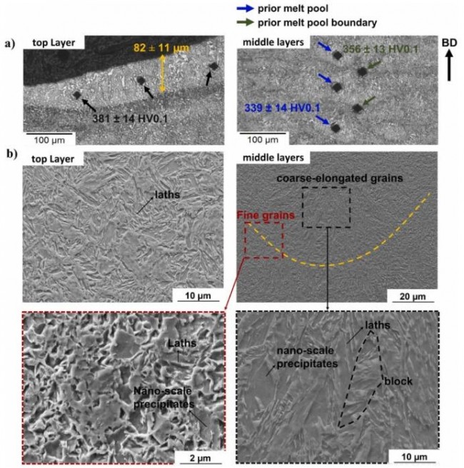 图 3. 与构建方向平行获得的竣工 120 W 状态的微观结构特征。(a) 光学显微照片和 (b) 大块样品最上层和中间层蚀刻横截面的 SE 显微照片。压痕表示显微硬度测量的位置。橙色虚线表示从(b)中的中间层拍摄的显微照片中先前的熔池边界。