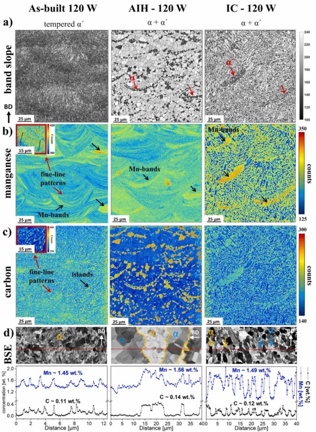 亚琛工业大学的研究人员采用激光粉末床熔融(L-PBF)技术加工成分与 DP600 双相钢类似的低合金钢。随后,进行两次L-PBF后热处理以获得铁素体-马氏体DP显微组织。第一次热处理包括奥氏体化,然后在铁素体 (α)/奥氏体 (γ) 区域 (AIH) 进行等温保持,而第二次热处理包括在 α/γ 区域进行临界间退火 (IC)。竣工状态表现出回火马氏体微观结构,具有弱(几乎随机)的晶体结构以及成分和形态的不均匀性。