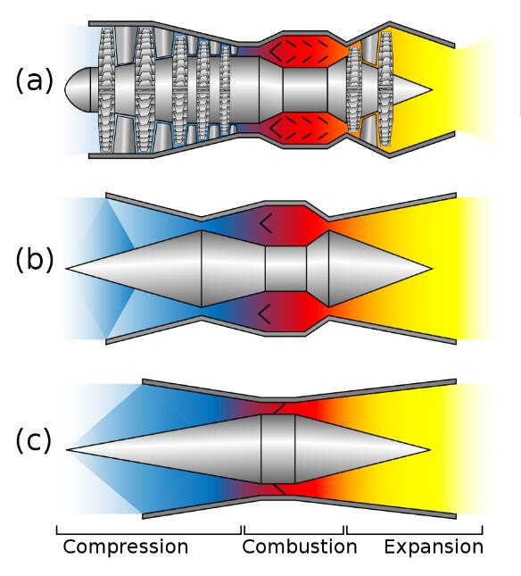 (a)涡轮喷气发动机,(b) 亚燃冲压发动机,(c)超燃冲压发动机