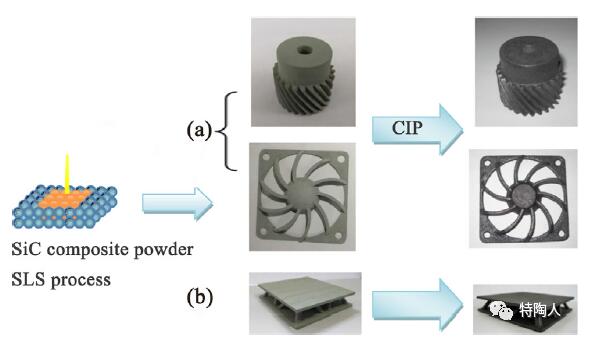 图3 复杂形状的SiC零件:(a) SLS和冷等静压结合的零件 (2.48 g/cm3);(b)未冷等静压的相同加工零件 (2.29 g/cm3)