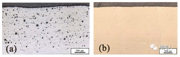 图4 用不同形状的粉末制成的零件横截面:(a) 不规则形状的颗粒;(b) 球形颗粒