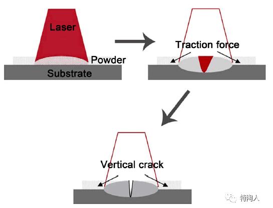 SLM过程是通过激光束扫描时接触区域迅速熔化并凝固,从而迅速致密化实现陶瓷的制备。由于能够通过高功率激光源将粉末熔化成液相,因此理论上可以生产几乎不需任何后处理的致密均质零件。但该技术的缺点是具有高能量密度的激光束会引起较大的热梯度,并伴随局部应力,从而导致陶瓷零件上微裂纹的形成因而影响性能。尽管有研究表示小粒径的球形陶瓷粉末有助于最终密度的提升 (图4),然而团聚现象也是不可避免的现象。因此,迫切需要对粉末的特性进行进一步的研究。当扫描速度恒定时,随着激光功率的增加,小颗粒首先熔化形成液相。此时,借助于毛细作用力,颗粒被重新排列成紧密致密的结构。激光功率越高,产生的液相越多,因此密度越高。但是,随着激光功率的不断增加,根据高斯分布,中心区域的能量密度将高于周围区域的能量密度。同时,中心区域的冷却速度明显比边缘区域的冷却速度慢,这使得在冷却过程中固化从边缘开始并延伸到中心区域。如图5所示,随着体积的缩小,中心区域将承受较大的拉力并易于出现垂直裂纹。