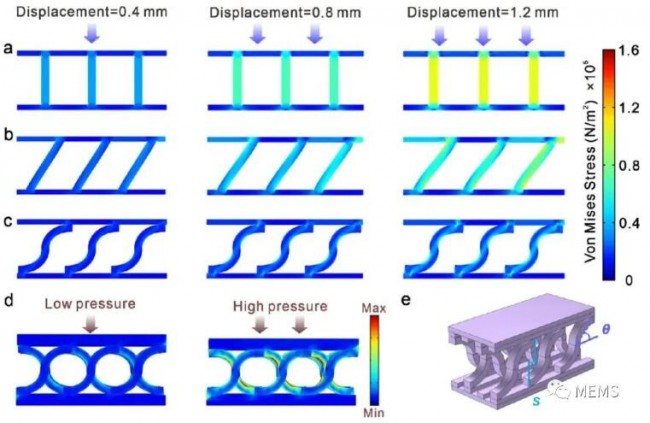 图2 压力传感器的模拟。不同位移下的应力分布:(a)微圆柱,(b)倾斜微圆柱,和(c)仿生猎豹腿。(d) 压力传感器在低压和高压下的三维应力分布。(e) 传感器优化参数示意图。
