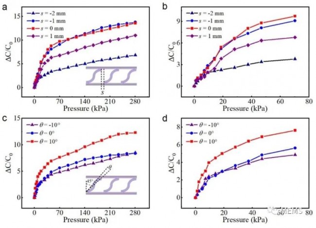 图3(a,b)仿生微结构的间距对柔性传感器灵敏度的影响。(c,d)仿生微结构的倾斜角度对柔性传感器灵敏度的影响。