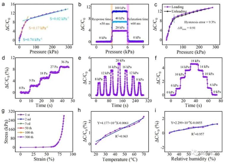 图4 压力传感器的特性表征。(a) 压力传感器电容响应曲线。(b) 压力传感器在20、40和100 kPa压力下的响应/恢复时间分别为80和90 ms。(c) 压力传感器的滞后误差为9.3%。(d)柔性传感器的低压检测。(e) 柔性传感器的可重复性。(f) 柔性传感器在不同压力下的稳健性。(g) 柔性传感器的应力-应变曲线。(h) 柔性传感器的温度性能扰动试验。(i) 柔性传感器的湿度干扰测试。
