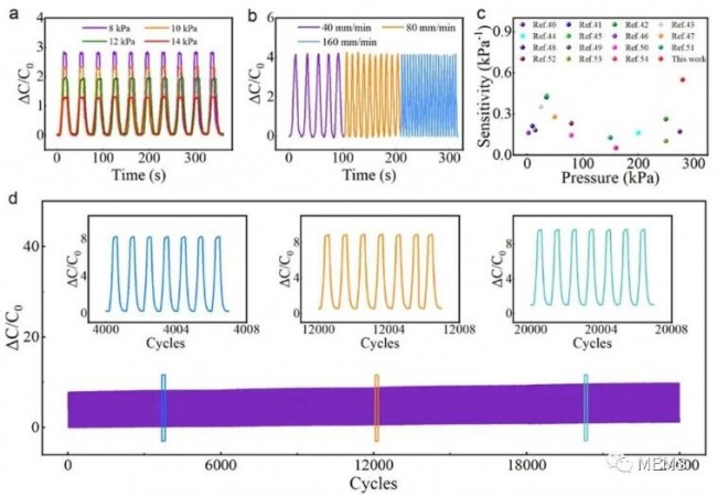 图5 压力传感器的性能表征。(a) 电容式压力传感器在不同压力(8、10、12和14 kPa)下的电容响应的重复性。(b) 传感器在不同速率(40、80和160 mm/min)下的电容响应。(c) 将电容式压力传感器的灵敏度和量程与现有研究进行了比较。(d)电容式压力传感器24000次循环的耐久性测试。