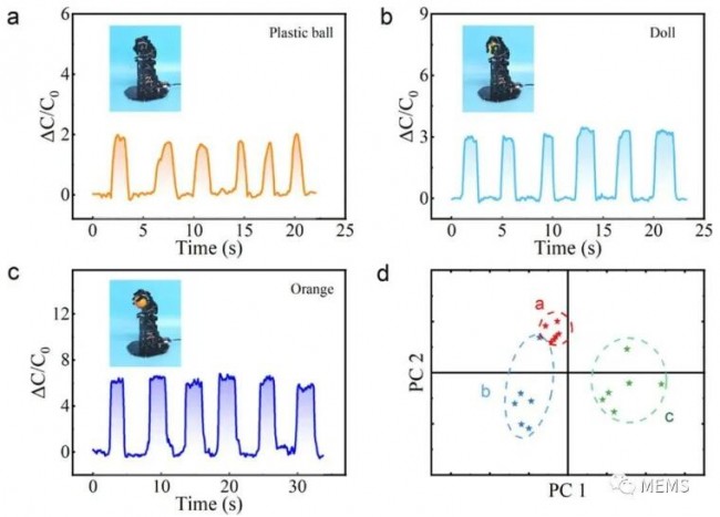 图7 压力传感器在智能操纵器中用于抓取对象。(a) 夹紧塑料块。(b) 抓着一个娃娃。(c) 抓着一个桔子。(d) 智能机械手抓取物体的二维PCA分类。