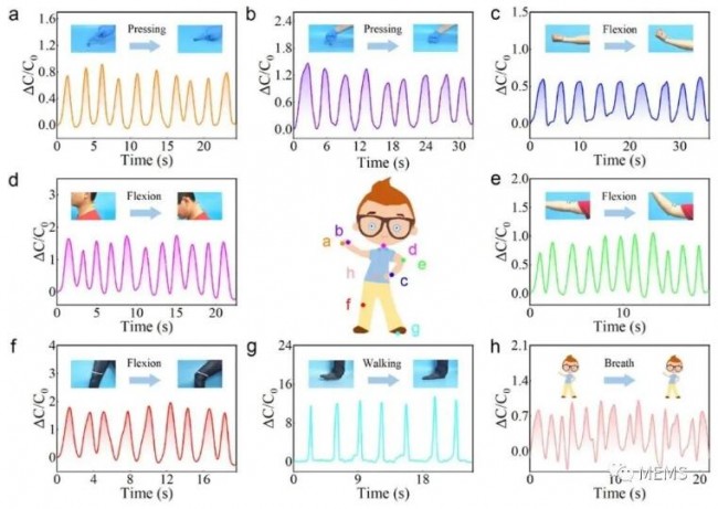 图8 用于人体运动监测的压力传感器。(a) 手指点击。(b) 拳头按压。(c) 手腕弯曲。(d) 颈部弯曲。(e) 肘部弯曲。(f) 膝盖弯曲。(g) 脚部压力。(h) 呼吸。