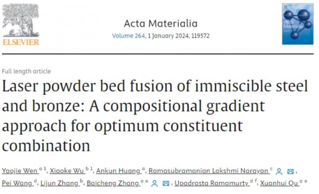 Yaojie Wen, Xiaoke Wu, Ankun Huang, Ramasubramanian Lakshmi Narayan, Pei Wang, Lijun Zhang, Baicheng Zhang, Upadrasta Ramamurty, Xuanhui Qu,Laser powder bed fusion of immiscible steel and bronze: A compositional gradient approach for optimum constituent combination,
