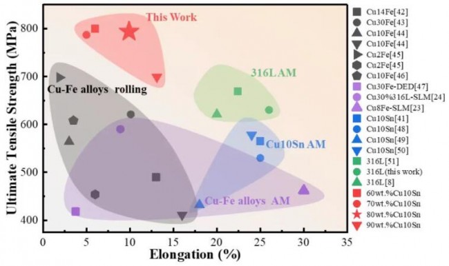 图3.增材制造方法和传统工艺生产的Cu-Fe合金极限抗拉强度和伸长率比较。
