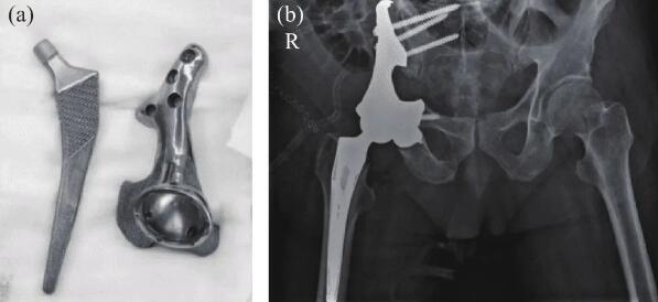 图10 3D打印钽金属骨盆和髋关节:(a)打印成品;(b)植入人体后X光照片