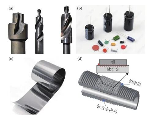 图2 钽在不同领域的应用:(a)切削刀具;(b)电容器;(c)高温隔热内衬;(d)金属植入体