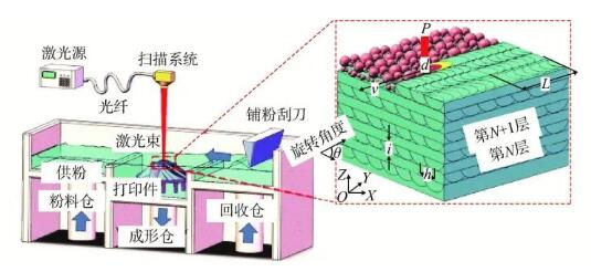 3D打印是一种新型加工方法,该技术最显著的特点是可以根据所导入的工件模型,直接形成最后的三维样品。3D打印中的激光粉末熔化技术(Laser Powder Bed Fusion, LPBF)和电子束粉末熔化技术(Electron Beam Melting, EBM)常被用于加工钽植入器械,LPBF 3D打印技术加工示意图如图3所示。LPBF加工设备有3个仓室,分别为粉料仓、成形仓和回收仓,打印前需提前将金属粉末加入粉料仓,加工时,粉末被刮刀均匀铺展在成形仓中,再由激光或电子束熔化加热后凝固成预先设定好的形状。粉末仓逐层上升,成形仓逐层下降,层层叠加最后成形。