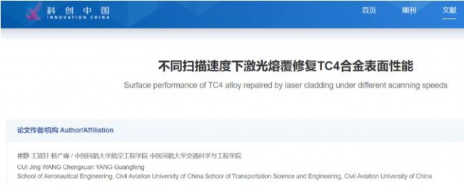 为拓宽激光熔覆再制造技术在微损坏钛合金零件修复领域的应用,《航空材料学报》期刊中发表的《不同扫描速度下激光熔覆修复TC4合金表面性能》一文研究了不同扫描速度对激光熔覆修复 TC4 合金表面性能的影响机制。