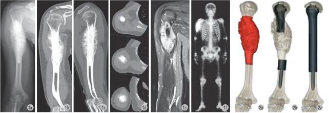 图1 例 1,男,19 岁,右侧肱骨近端硬化性骨肉瘤 a~d:术前 X 线、三维 CT 显示肿瘤侵犯右肱骨近端;e:术前 MRI 示右肱骨远端骨质破坏伴软组织包块;f:术前 SPECT 显示右肱骨近端核素浓集