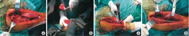 图4 术中假体植入情况 a、b:瘤段切除残余肱骨近端;c:远端扩髓植入假体柄后进行压配;d:植入假体后用 Marlex 补片重建不完整的肌肉