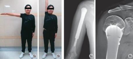 手术 2.1~4.2 h,平均 (3.3±0.7) h;术中出血量:150.0~340.0 ml,平均 (213.1±49.9) ml。所有患者均保留完整冈上肌及大部分冈下肌,小圆肌很少被保留,肩胛下肌的一部分被保留。术后随访20~63 个月,平均 45 个月。肌肉骨骼肿瘤协会评分 (musculoskeletal tumor society,MSTS) 得分为84%~99%,平均 94.4%;较术前明显改善,差异有统计学意义。系列随访中患肢平均短缩 1.64 cm,患侧肩关节平均 ROM 为前屈 84.8°,外展为 79.5°,后伸为 26.8°,内收为 16.2° (图 5)。