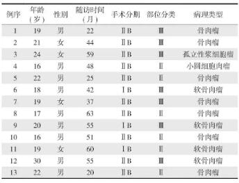 本研究共纳入 13 例,男 9 例,女 4 例,年龄16~30 岁,平均 (20.2±3.8) 岁。所有患者都接受了 X 线、肱骨 CT 三维扫描、胸部 CT 薄层扫描、上肢上臂 MRI 以及全身骨扫描或正电子发射断层扫描等术前影像学评估 (图 1)。所有患者均进行了术前活检明确病理诊断,手术分期采用 Enneking 系统分期 [27],参照 Kumta 等 [28] 提出的骨骺板与肿瘤相对位置进行分类,并按照 NCCN 的骨肿瘤指南,对高等级肉瘤患者进行新辅助化疗 (表 1)。