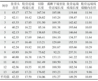 肱骨头直径:40.1~45.9 mm,平均 (42.2±2.0) mm;切除长度:75.6~176.0 mm,平均 (134.1±48.9) mm;残余肱骨近端长度:16.2~19.8 mm,平均 (17.6±1.1) mm;残余肱骨远端的长度:103.7~237.3 mm,平均 (151.35±62.2) mm (表 2)。