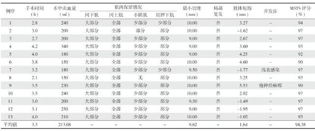 假体头部直径:33.0~42.0 mm,平均 (35.4±2.3) mm;根据不同的切除长度,假体长度:120.0~240.0 mm,平均 (180.8±42.7) mm;根据残余长度和髓内腔的直径,假体髓内柄长度:45.0~55.0 mm,平均 (47.7±3.8) mm;假体髓内柄直径:10.0~12.0 mm,平均 (10.7±1.8) mm (表 3)。