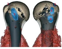 所有假体均由四川大学华西医院屠重棋教授团队独立设计,并委托中国北京通州春丽正达器械有限公司 (Chunli Co.,Ltd.,Tongzhou,Beijing,China) 制作生产。假体设计主要原则为个性化模拟正常尺寸和外观,以保证截骨的精确性和植入物与骨缺损匹配的精确性。假体由头、干和柄组成。头部形状的设计选择半球形结构,采用了中心实体外层多孔的结构理念设计假体头,增加了一些包括缝合孔和锥状结构等特殊设计以提高骨 -假体界面的初始稳定性。