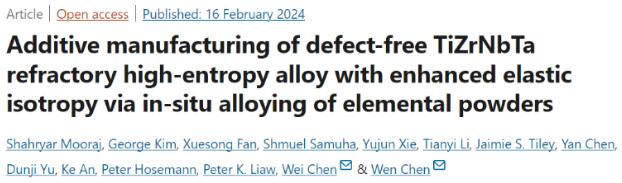 美国马萨诸塞大学的Shahryar Mooraj和伊利诺伊理工大学的George Kim等人基于标准化模型的加工图,确定了一个同时考虑能量输入和材料热力学性质的有效加工窗口,通过在L-PBF过程中元素粉末的原位合金化制备了几乎无缺陷的TiZrNbTa难熔高熵合金,降低了加工缺陷。并且发现增材制造中的快速冷却速度可增强材料的化学均匀性和弹性各向同性,并保持相当的机械性能。本工作中介绍的加工方法通常可以扩展到其他耐火合金系统。该工作以《Additive manufacturing of defect-free TiZrNbTa refractory high-entropy alloy with enhanced elastic isotropy via in-situ alloying of elemental powders》为题发表在《Communications materials》上。