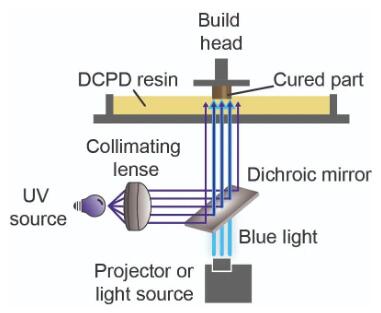 ▲SWOMP(选择性双波长烯烃复分解 3D 打印)同时使用两种波长的光来改变某些材料的 3D 打印方式