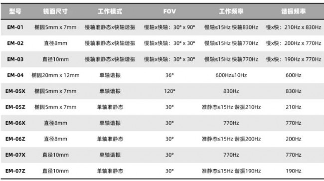 感测通新推出的一系列体积更小的一维振镜可满足更多的应用场景,镜子包含准静态和高频谐振模式,均配备对应的开发板供客户拓展应用场景。