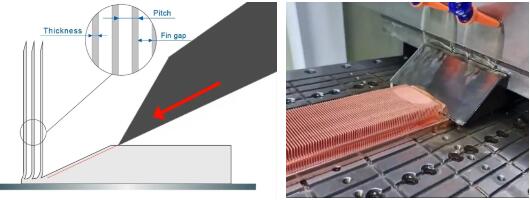 如今,半导体行业所依赖的冷却板和其它冷却装置通常是通过挤出成型,压铸成型或称为刨削的工艺制造而成。在后者工艺中,一块平整的金属板(通常是铜)要经过类似刨削的操作,将薄片材料剥离,弯曲成散热片(如下图所示)。所得散热鳍片的效率比前两种工艺生产的散热器的冷却能力分别会高出12%-22%和62%-74%[2]。但是,这种工艺仅限于生产直线、线条规则的散热片,而且只能在一个方向上生产,在几何形状上也受到限制。鳍片的厚度通常为原始板厚的1/3到1倍。当纵横比越低或/和鳍片越多时,整体的散热效率就越高。材料通常为经阳极氧化处理或者电镀镍的铝,以及经抗氧化处理的铜或电镀镍的铜。