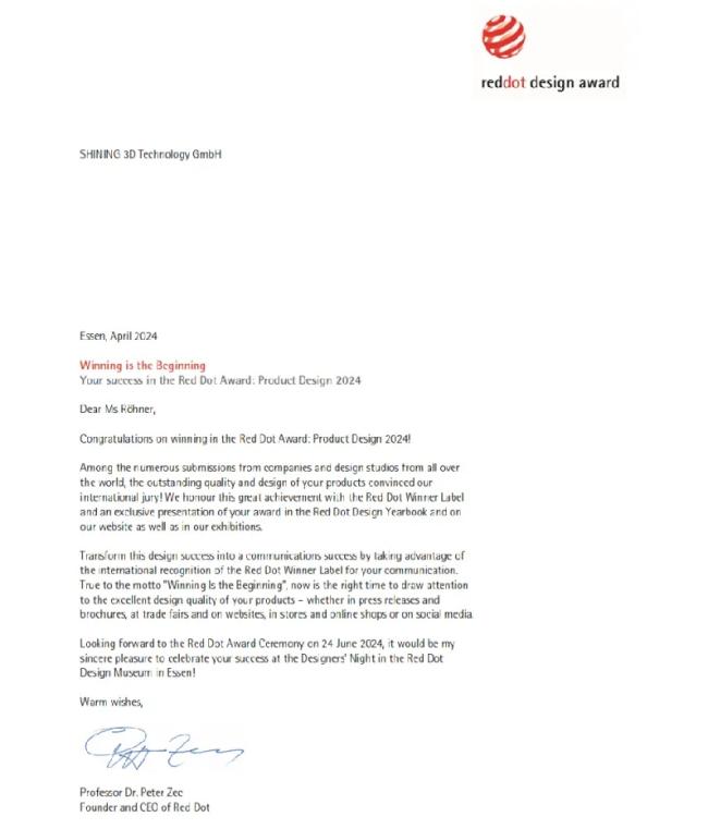 据悉,2024年红点奖的评选工作由40位国际评审团成员执行,评审团汇集了享誉全球的设计师、设计学教授和资深媒体人,根据产品在创新性、美观性、功能性和智能性等方面的表现进行综合评选。本次斩获奖项的先临三维高精度3D扫描仪,兼具技术创新、审美价值、便捷智能与效能提升,符合红点奖对于设计美学与科技创新的高标准要求。