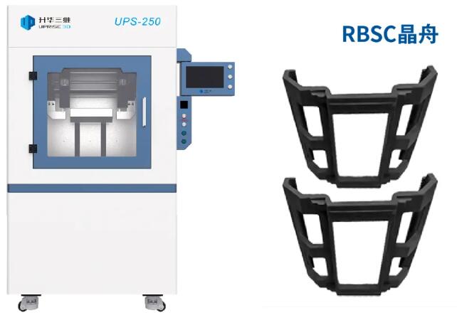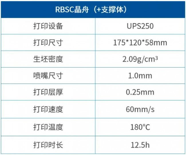 RBSC晶舟采用升华三维的工业型独立双喷嘴3D打印机UPS-250打印成型,该设备可实现大尺寸(250×250×250mm)陶瓷结构件制备,RBSC生坯密度可达2.09g/cm3,设备运行稳定,可实现长时间3D打印。最终生坯的整体尺寸偏差范围为±1mm,可通过软件设计放大系数进行尺寸补偿。再采用成熟反应烧结工艺制造出的RBSC晶舟可满足使用需求。