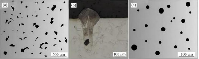 ▲图1 AM中常见的孔洞形貌,(a)不规则形孔洞;(b)匙孔;(c)球形孔洞